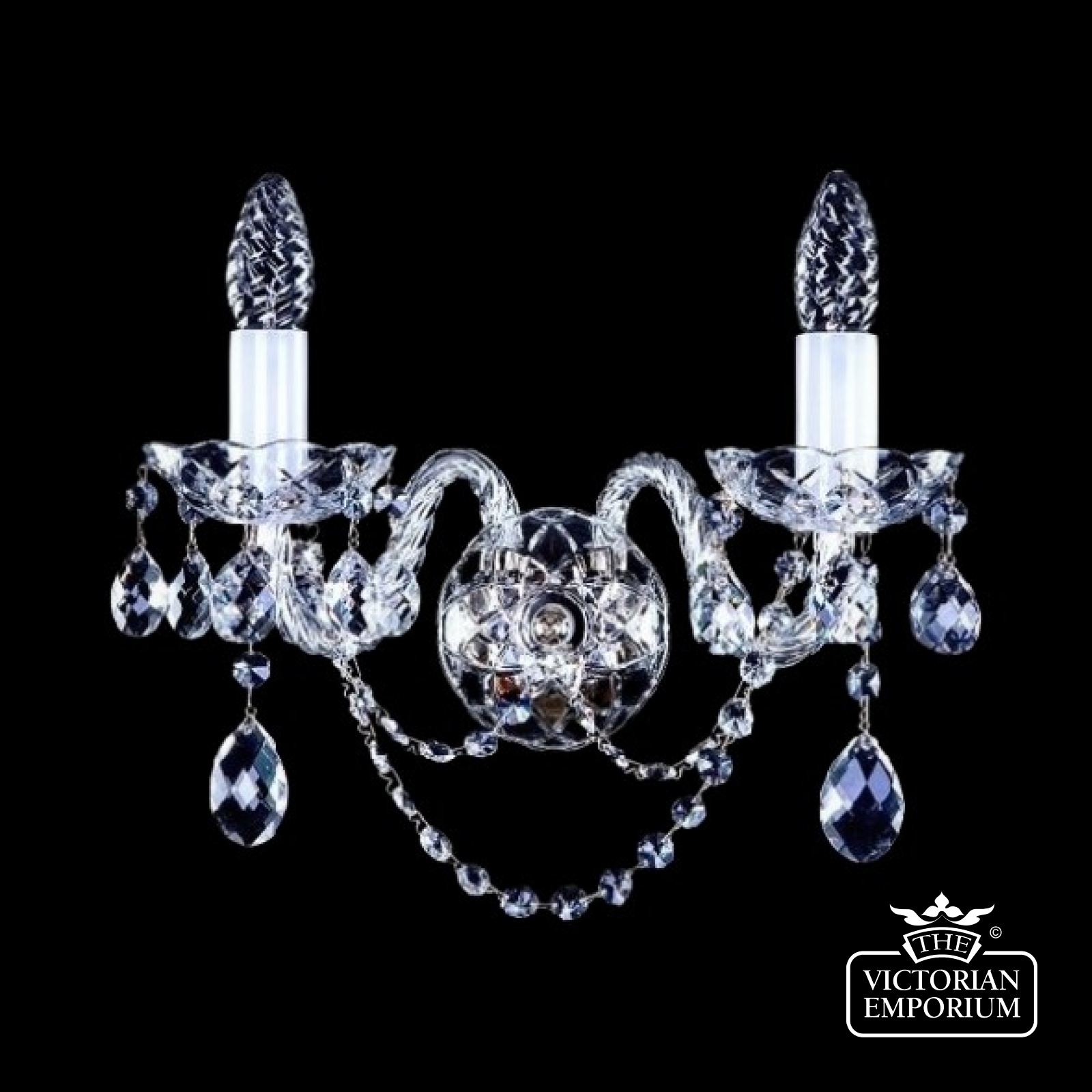 Elegant wall sconce with rope twist glass arms, white glass candle holders, ornate glass bobeches and oval shape crystal drops
