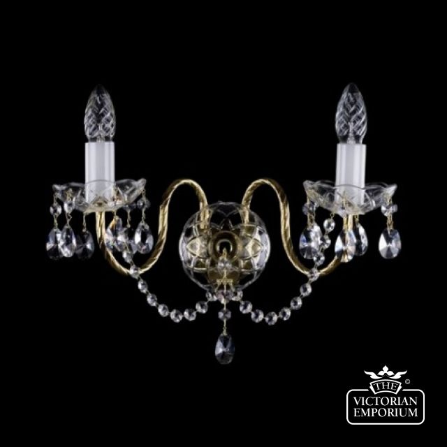 Beautiful design with ornate metal rimmed arms and oval shaped bohemian crystal (30%PbO) drops. Wall sconce shown in the gold finish