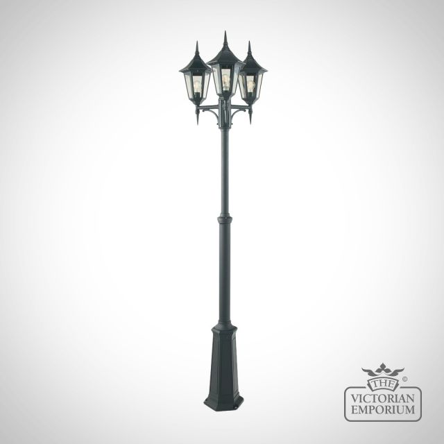 This is a large and elegant triple head lamp post with tall spires giving it height and presence in all outdoor locations, made from die cast Aluminium, powder coated