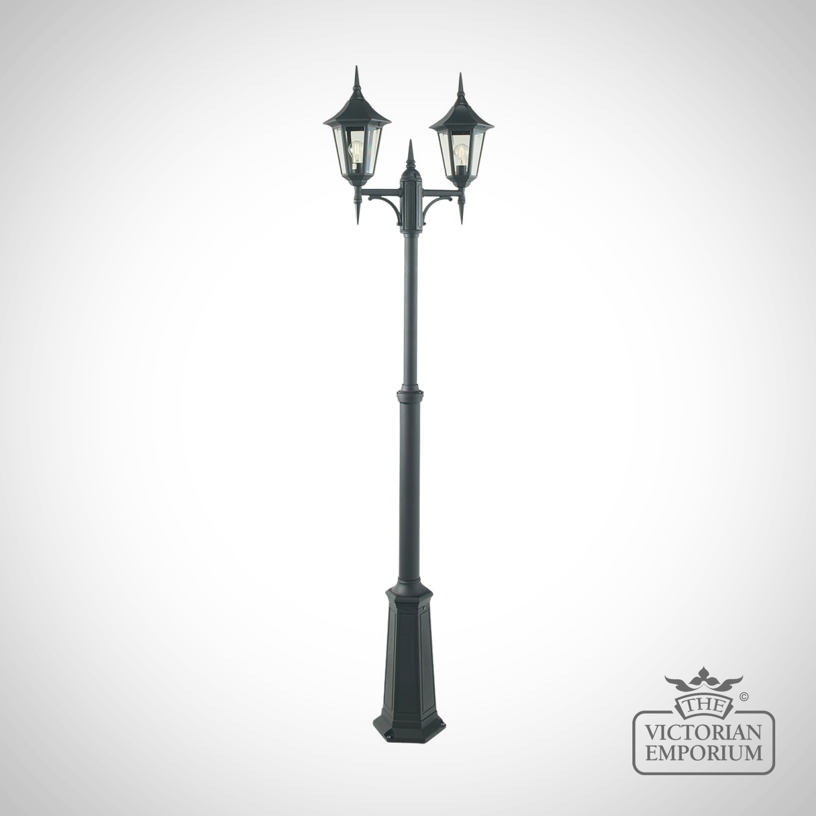 This is a very elegant double lamp post with a tall spire tops on the lanterns giving it height and presence in all outdoor locations, made from die cast Aluminium, powder coated
