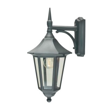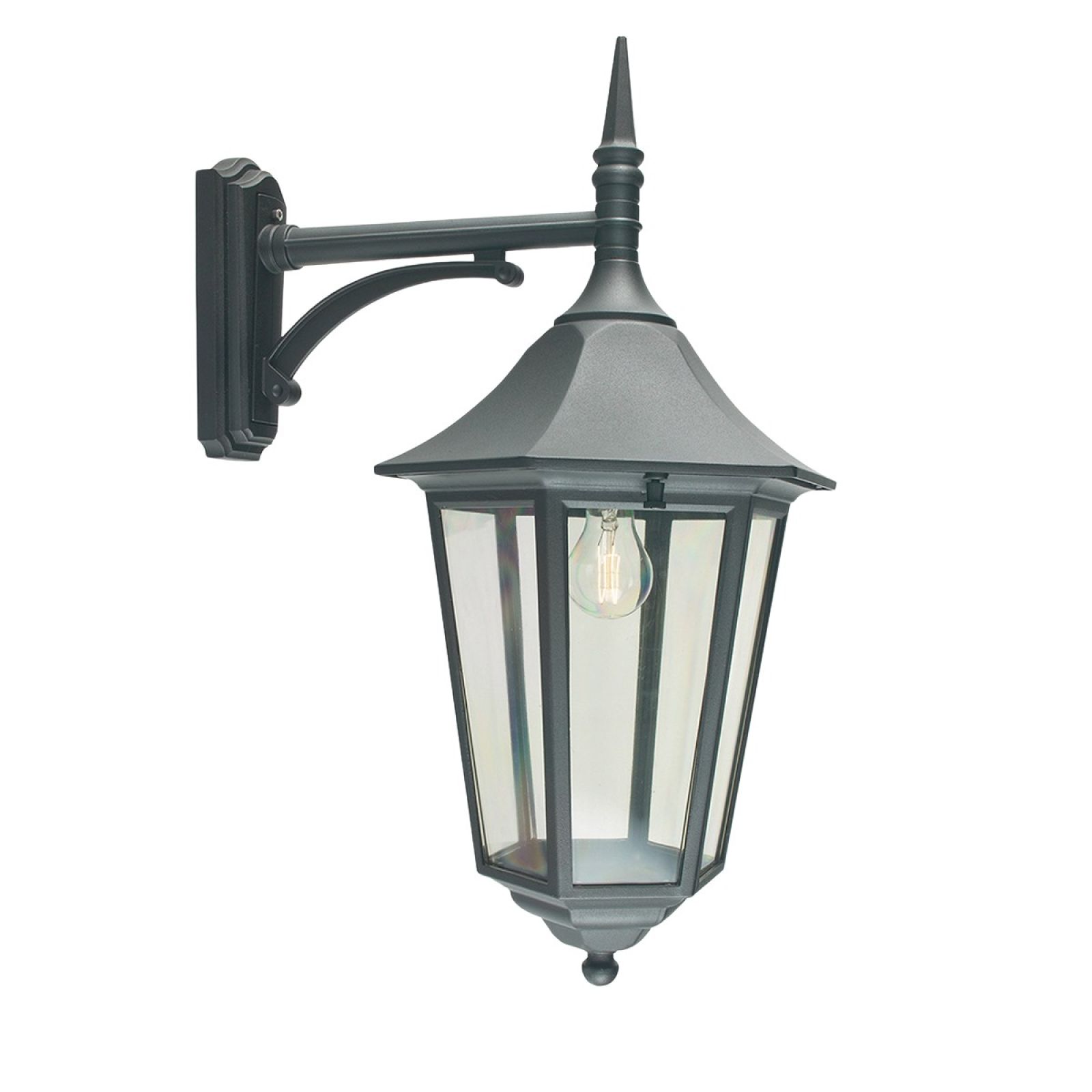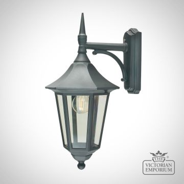 This is a very elegant down black wall lantern with a pointed top giving it height and presence in all outdoor locations, made from die cast Aluminium, powder coated