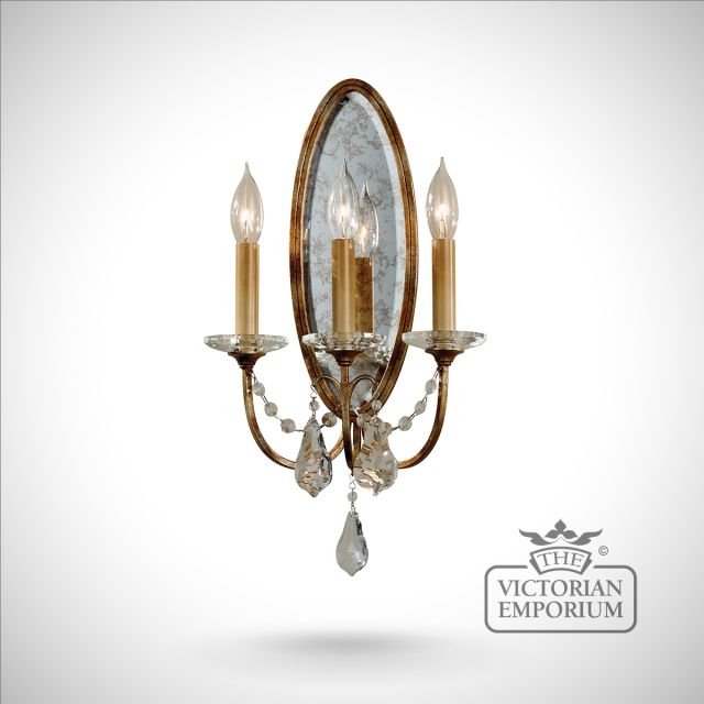 This triple wall sconce has a turn of the century influence with a frame finished in Oxidised Bronze with clear polished glass crystals. Each bulb sits in its own crystal bobeche