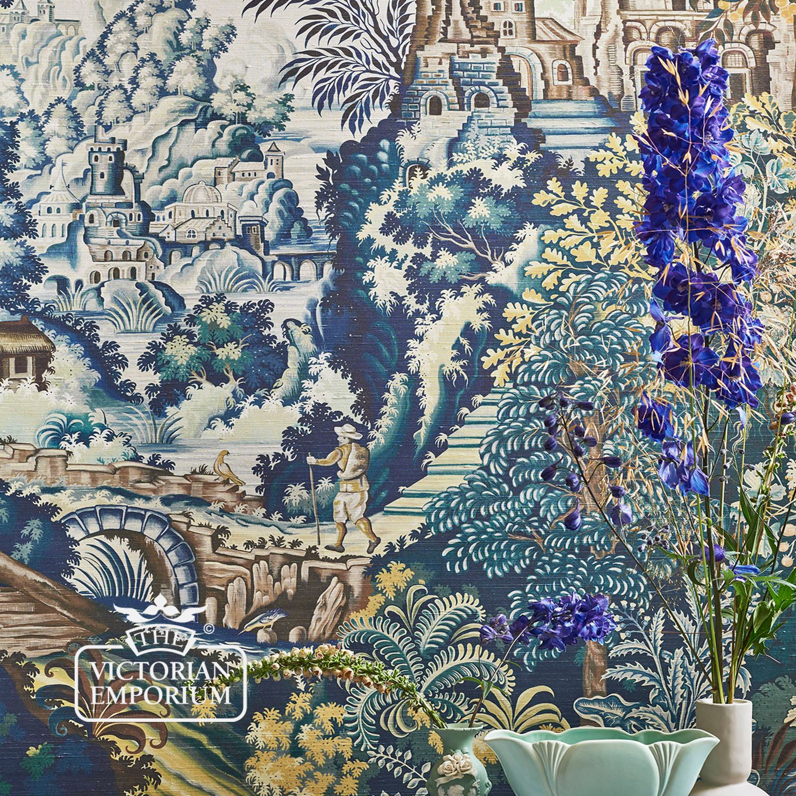 Its soft palette is reminiscent of beautifully aged tapestries, with its natural base ensuring that every panel is distinctly unique. Designed to perfectly fit an interior, this bespoke design can be tailored to any space, made up of 2 drops measuring 105cm, forming a full panel of 210cm wide x 350cm high. Each drop is printed on a 137cm wide roll, leaving a selvedge of 16cm on either side for overlapping and splicing when applying this wallcovering.