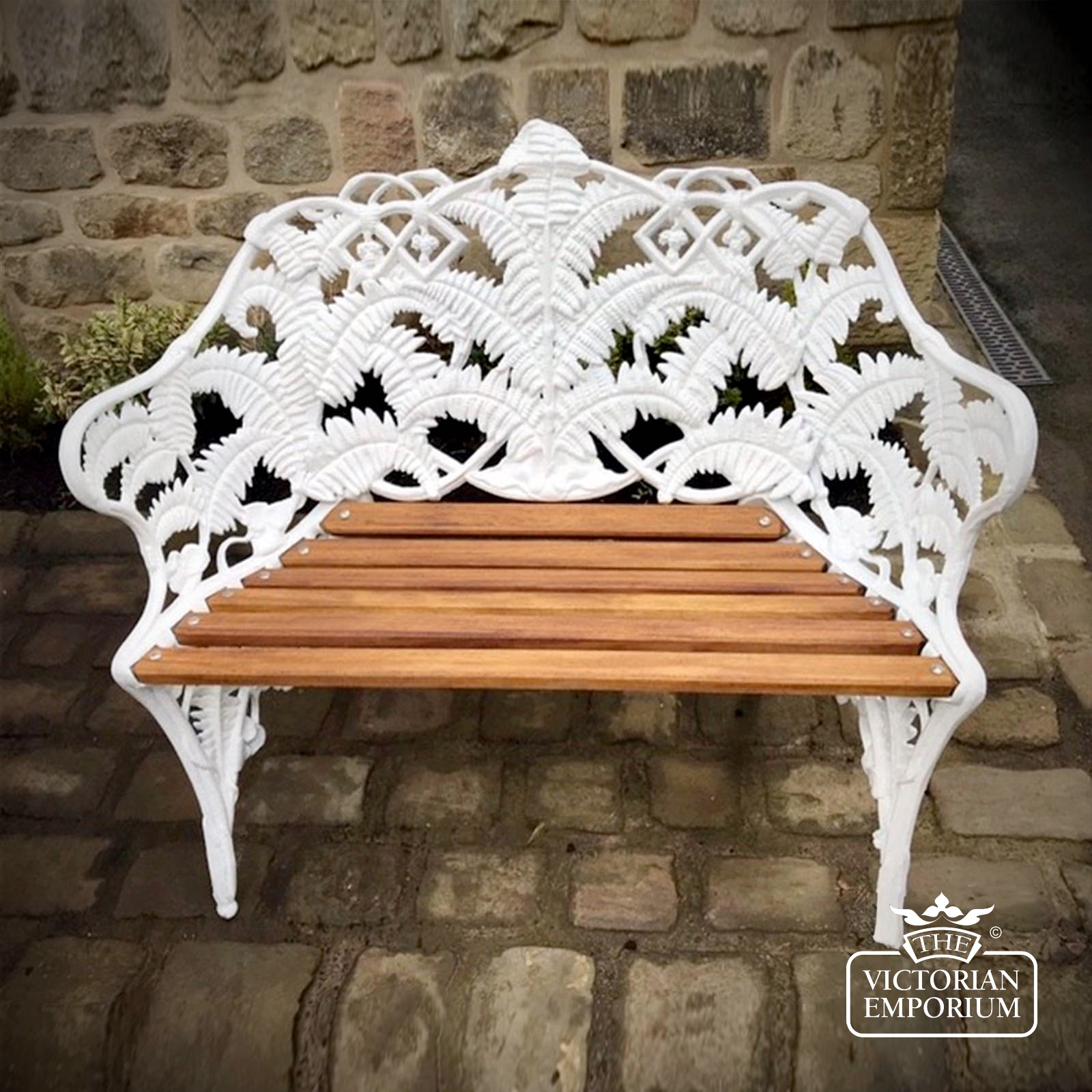 Garden bench in cast aluminium and powder coated for a durable finish, in a choice of colours in a beautiful Fern Leaf design with a wooden seat. This design is a replica from the Coalbrookdale collection from the 1800's.