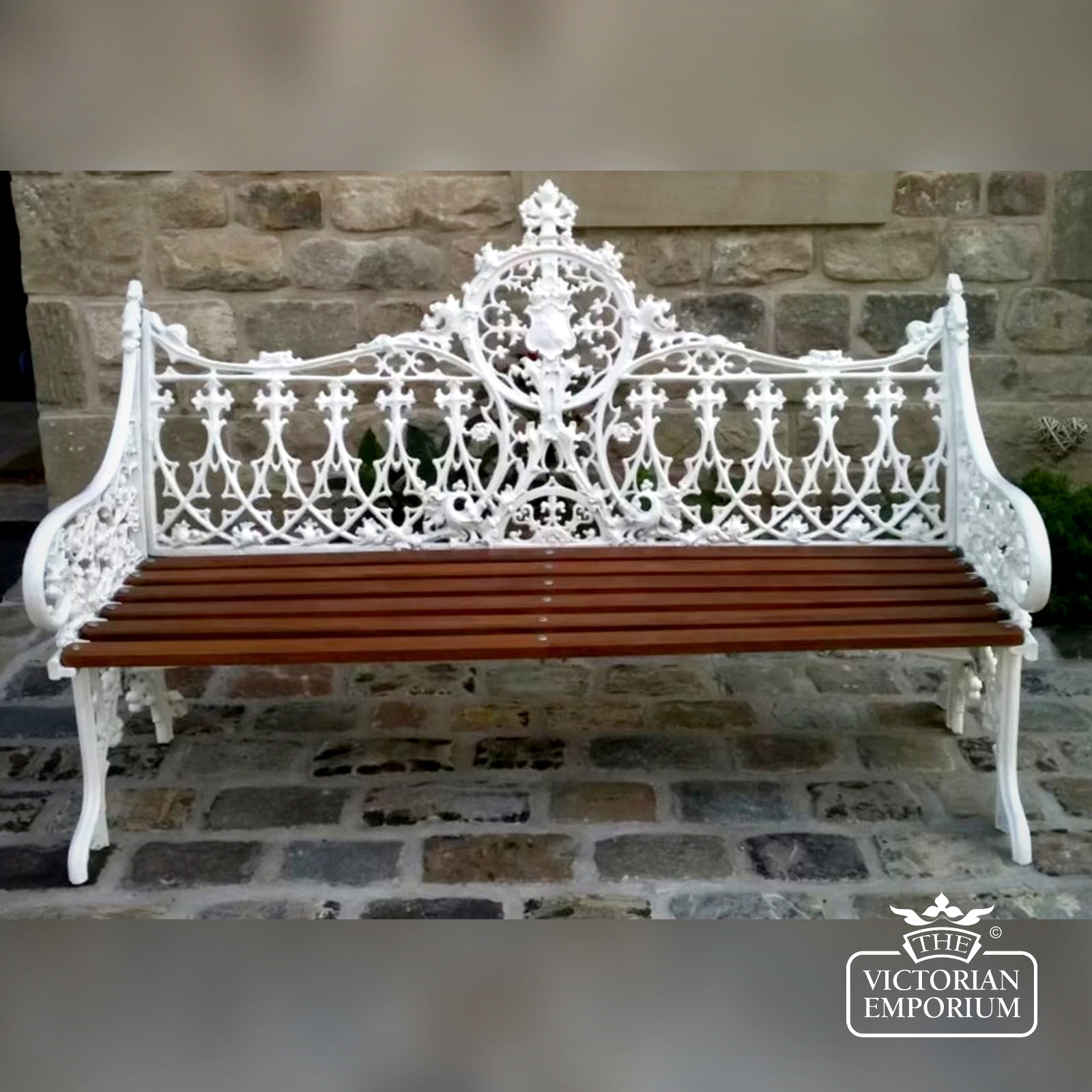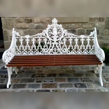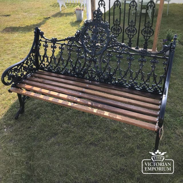 Garden bench in cast aluminium and powder coated for a durable finish, in a choice of colours in a beautiful Gothic design with a wooden seat. Replica of an iron bench designed by the Coalbrookdale foundry in 1855 - a truly grand garden bench.
