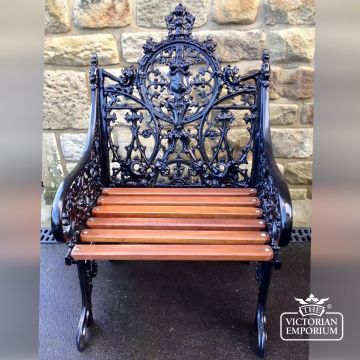 Garden Throne Chair in cast aluminium and powder coated for a durable finish, in a choice of colours in a beautiful Gothic design with a wooden seat. Replica of a design by the Coalbrookdale foundry in 1855 - a truly grand garden throne.