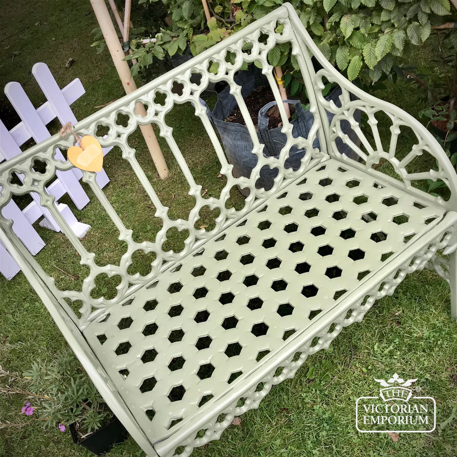 Garden bench in cast aluminium and powder coated for a durable finish, in a choice of colours in a beautiful Regency design with a solid cast seat in a hexagon design. This design is a replica from the Coalbrookdale collection from the 1800's.