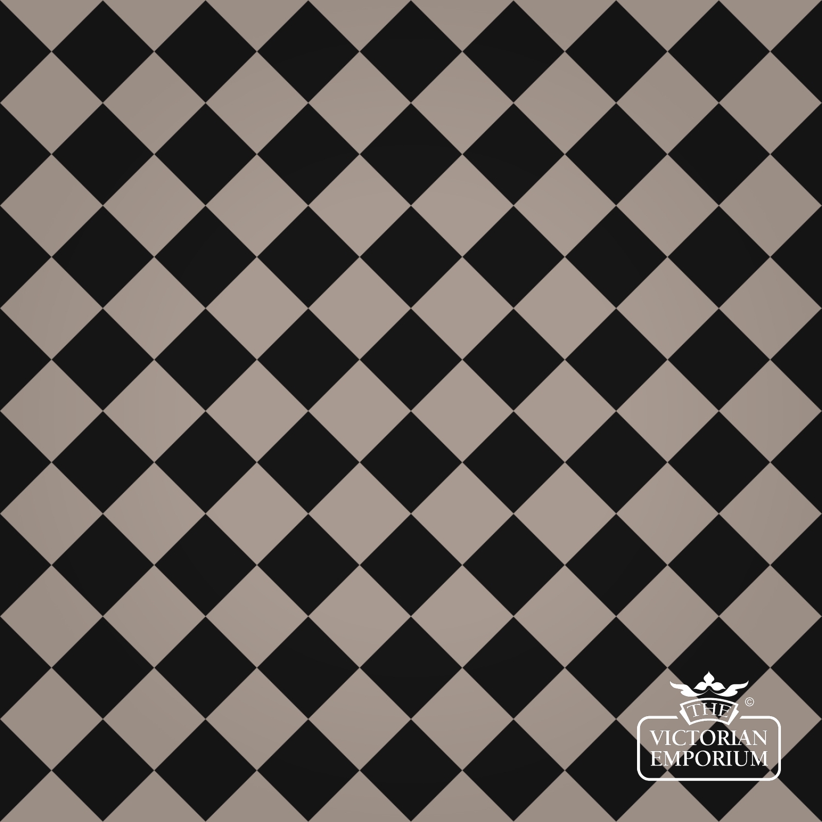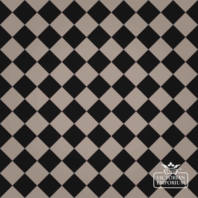 Black and grey floor Victorian Path tiles making up a chequerboard pattern. Can also be turned 45 degrees to make a diamond pattern.