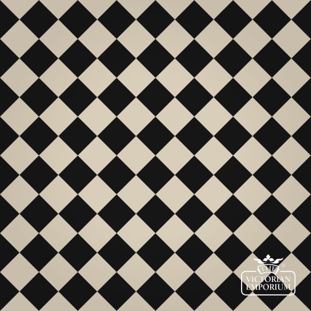 Black and off white floor Victorian Path tiles making up a chequerboard pattern. Can also be turned 45 degrees to make a diamond pattern.