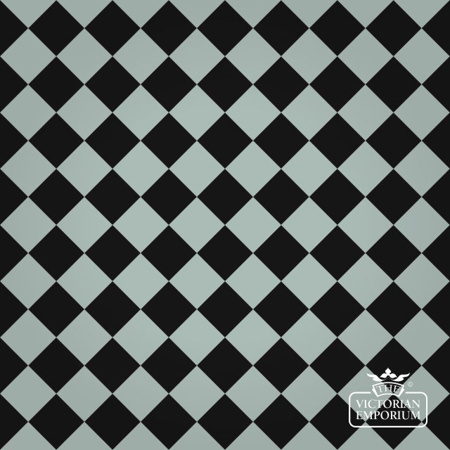 Black and sky blue floor Victorian Path tiles making up a chequerboard pattern. Can also be turned 45 degrees to make a diamond pattern.