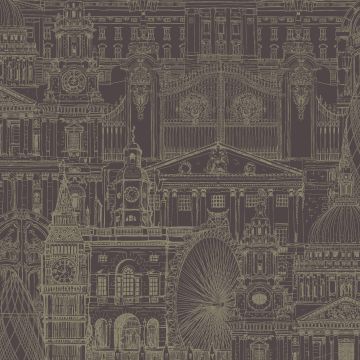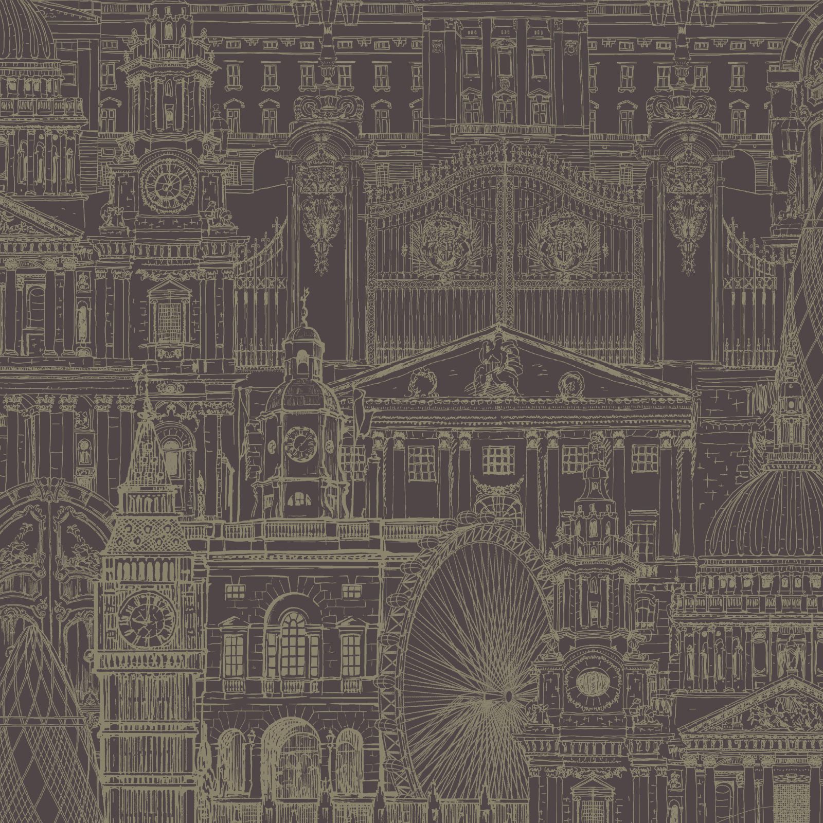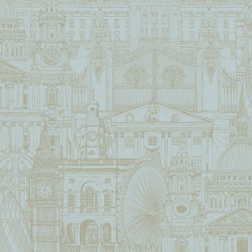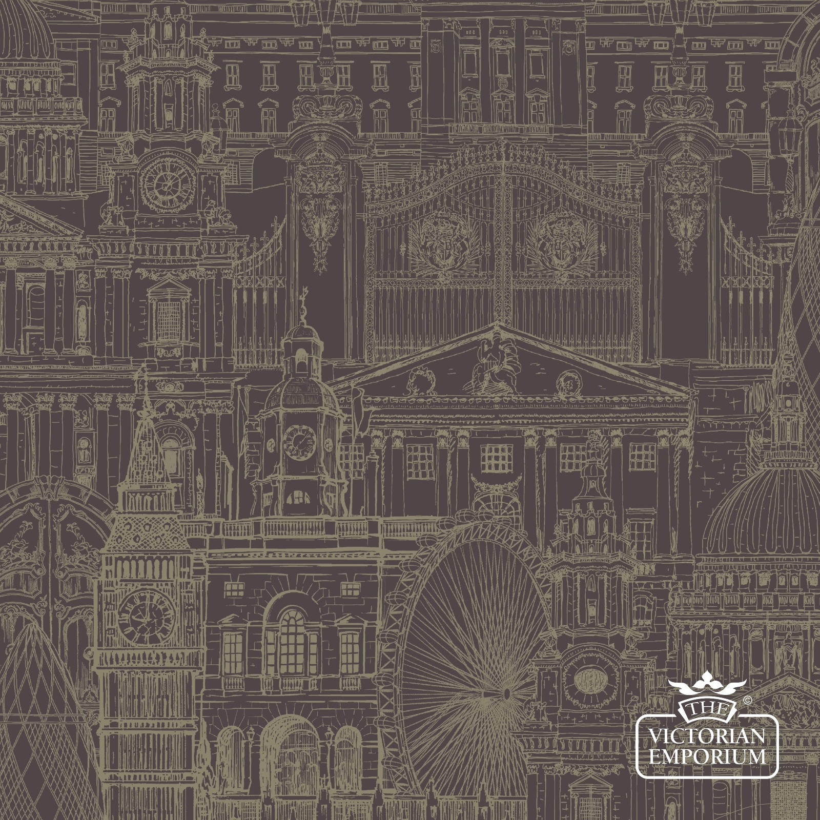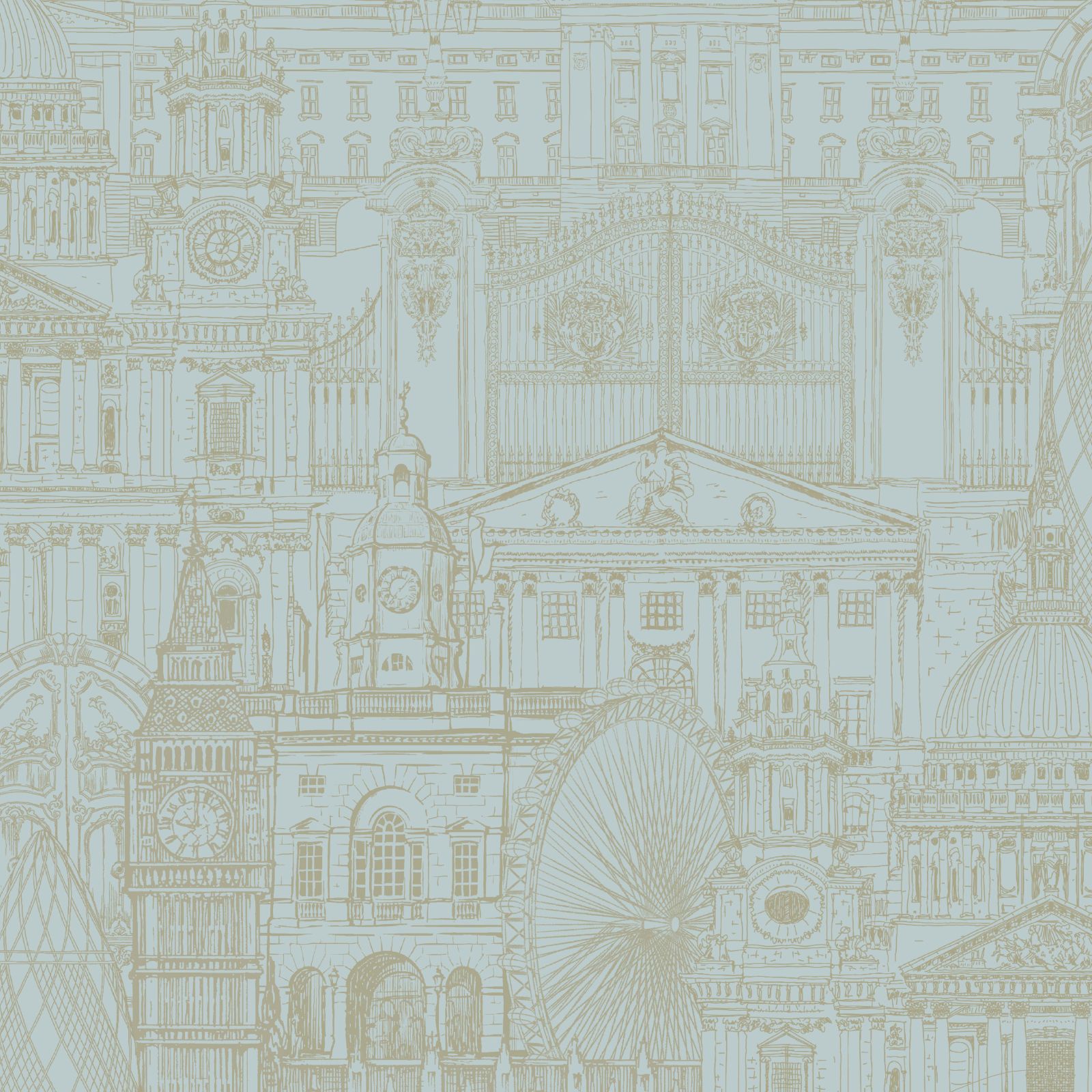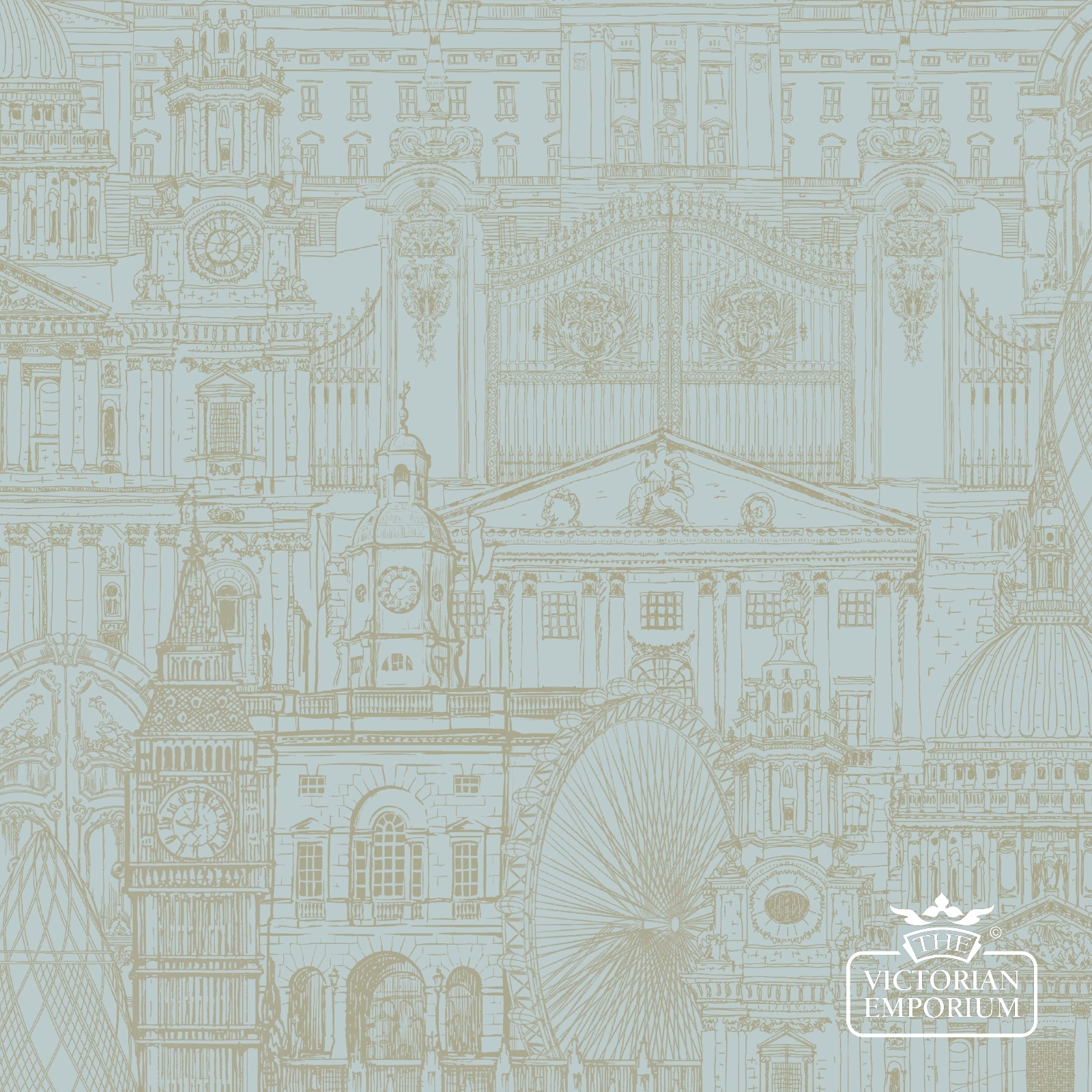 A hand drawn wallpaper design featuring the modern London cityscape in a hand drawn Victorian style. This design would be suitable for a reception room or feature wall. In a choice of aqua or dark grey.