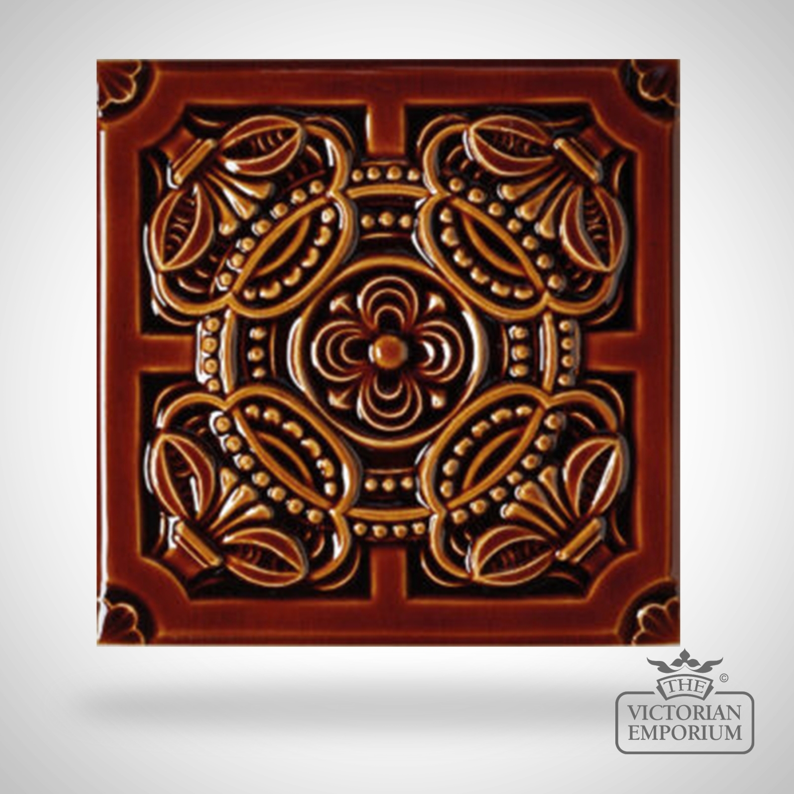 Decorative exterior use Victorian wall tiles in relief pattern with Leeds single coloured design