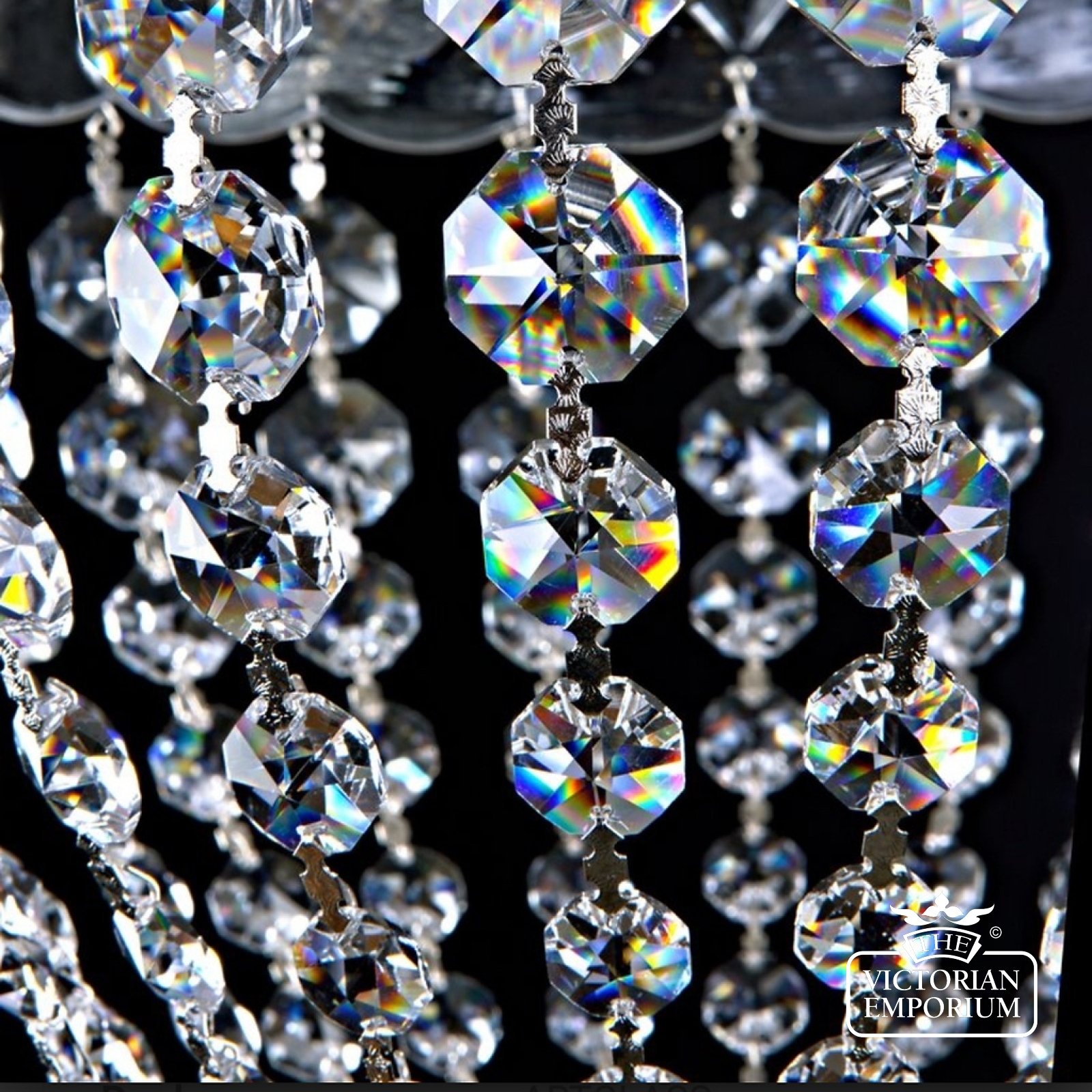 This chandelier comes fully assembled with crystals and is shown here in the nickel finish. Smaller version & sconces are available.