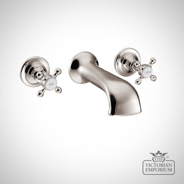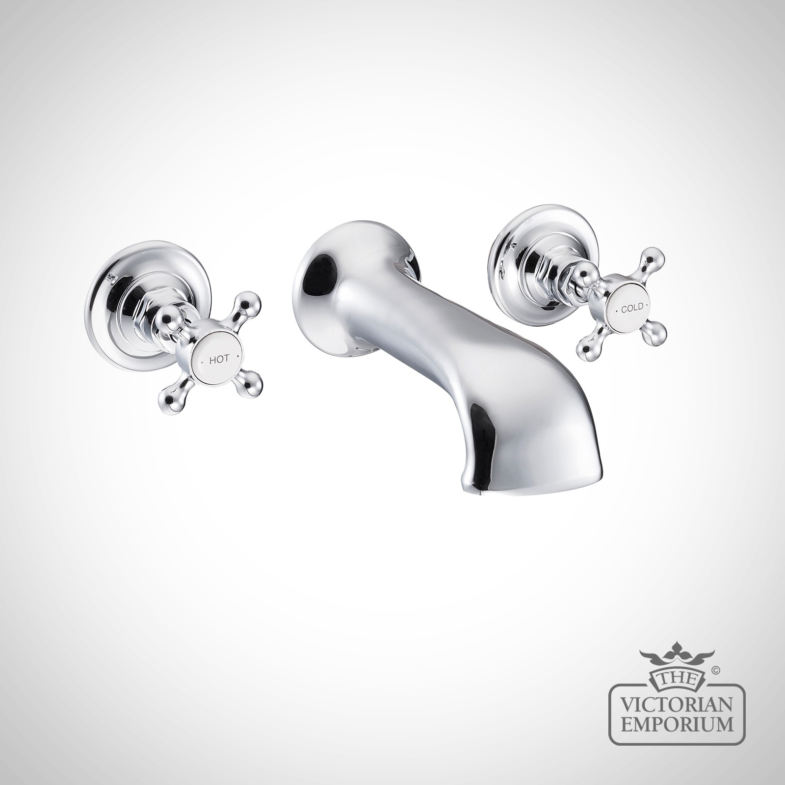 This is a wall mounted three piece bath filler with hot and cold taps and a separate spout