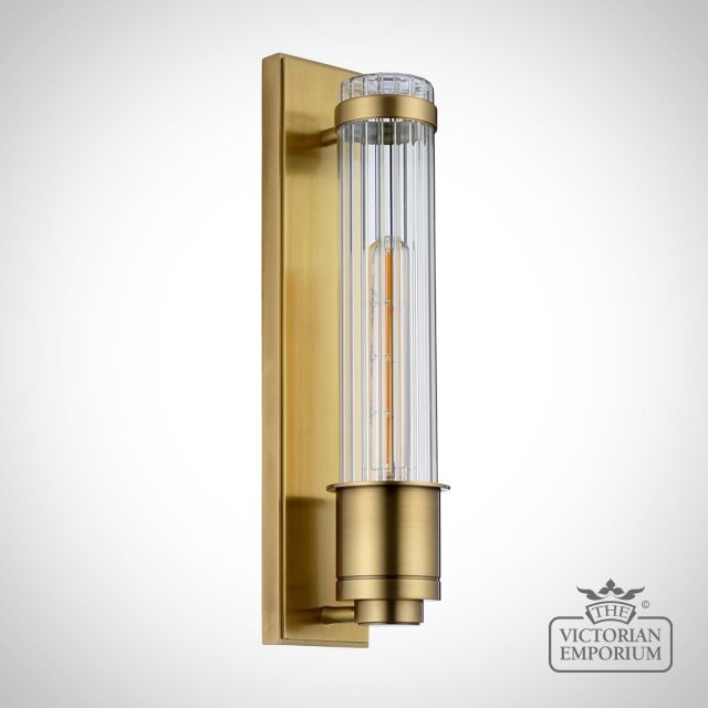 Single Bathroom Wall Light in an Aged Brass finished with a tall, linear design with vintage inspiration giving an elegant feel. Constructed from Steel and Ribbed Glass