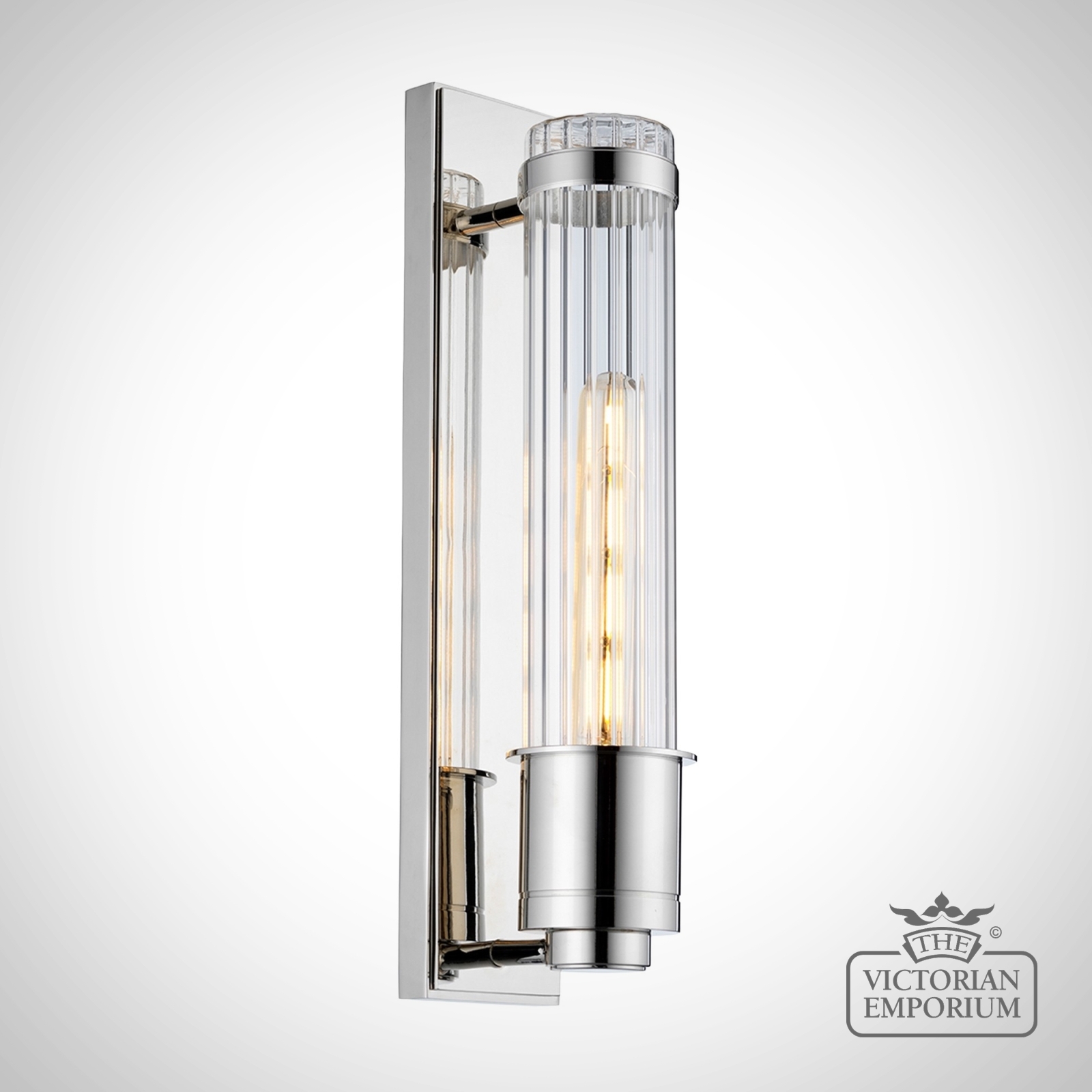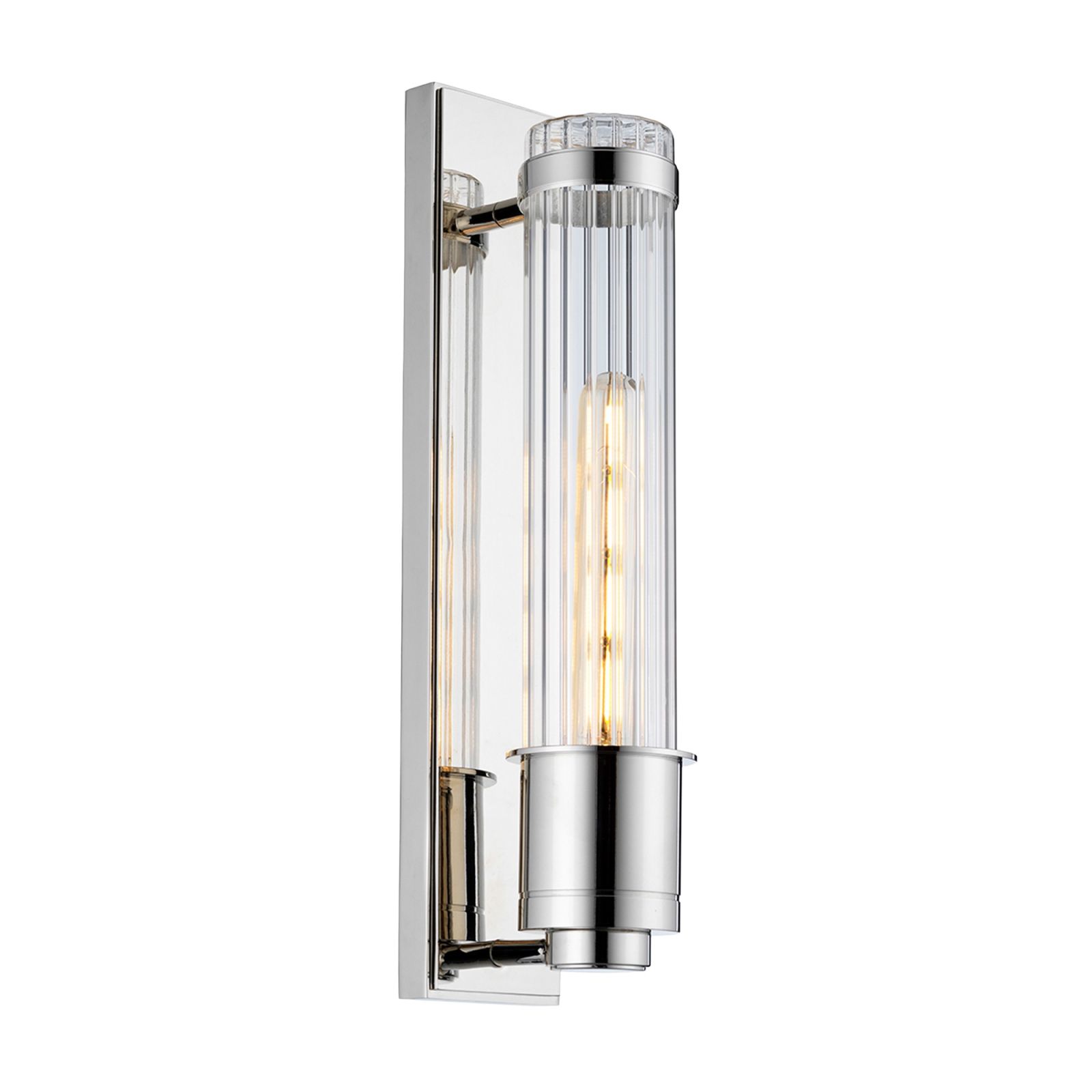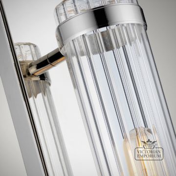 Single Bathroom Wall Light in Polished Chrome finish with a tall, linear design with vintage inspiration giving an elegant feel. Constructed from Steel and Ribbed Glass