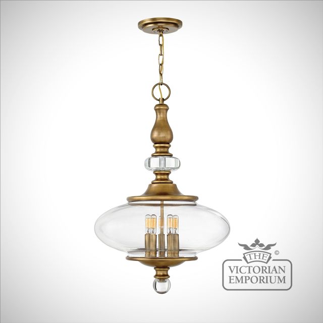 This traditional pendant has an oval shaped clear glass centre with decorative cast details and decorative crystals, with a rich brass finish