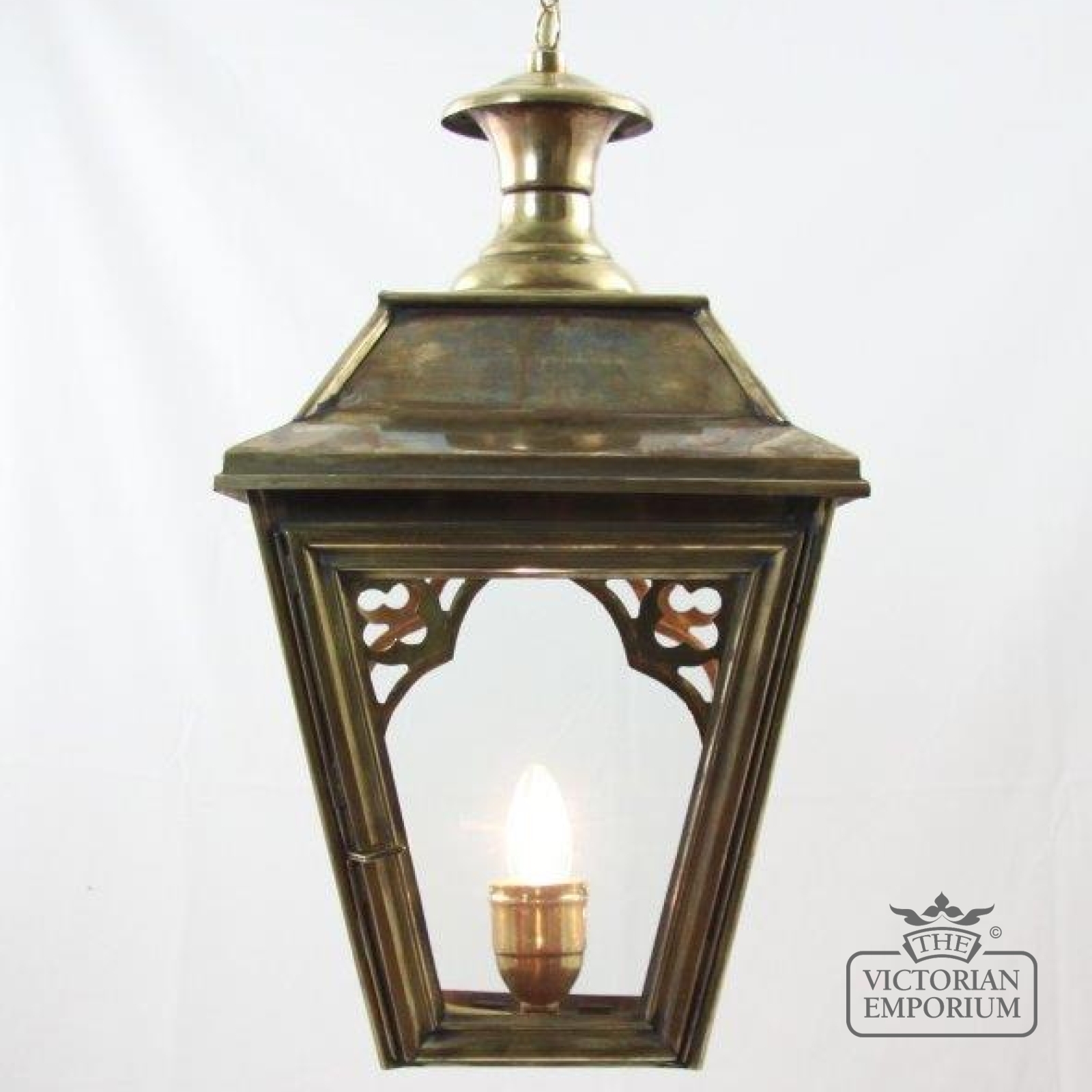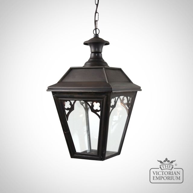 This is a medium sized classic Victorian gothic style ceiling lantern made from solid brass in an antique bronze finish. Made from solid brass and glass