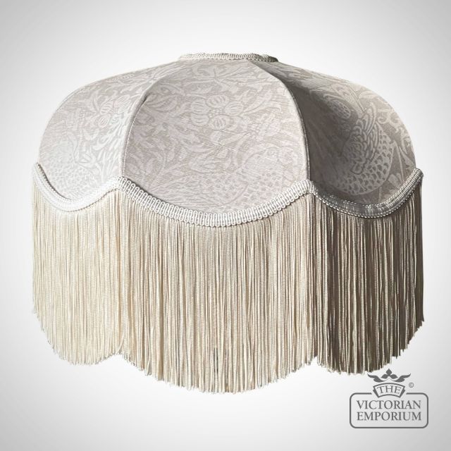 This is a beautiful Victorian Style lamp shade with a William Morris beige fabric and fringing that can be purchased in a choice of sizes so that you can use it for table lamps, standing lamps, wall lights and ceiling lights around your period home