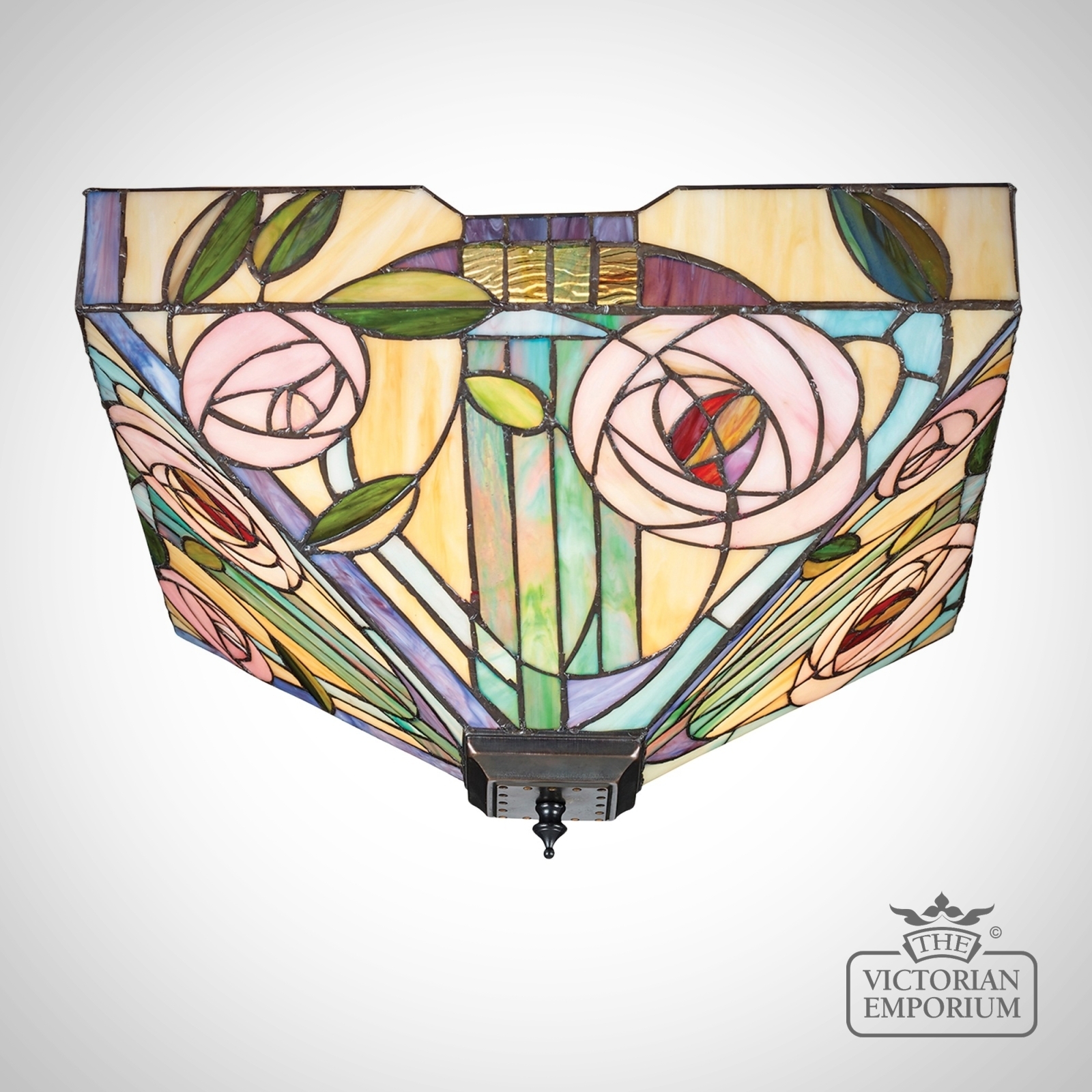 The Willow flush ceiling light incorporates the famous Mackintosh style rose, with subtle pretty colours, complemented by a dark bronze fitting