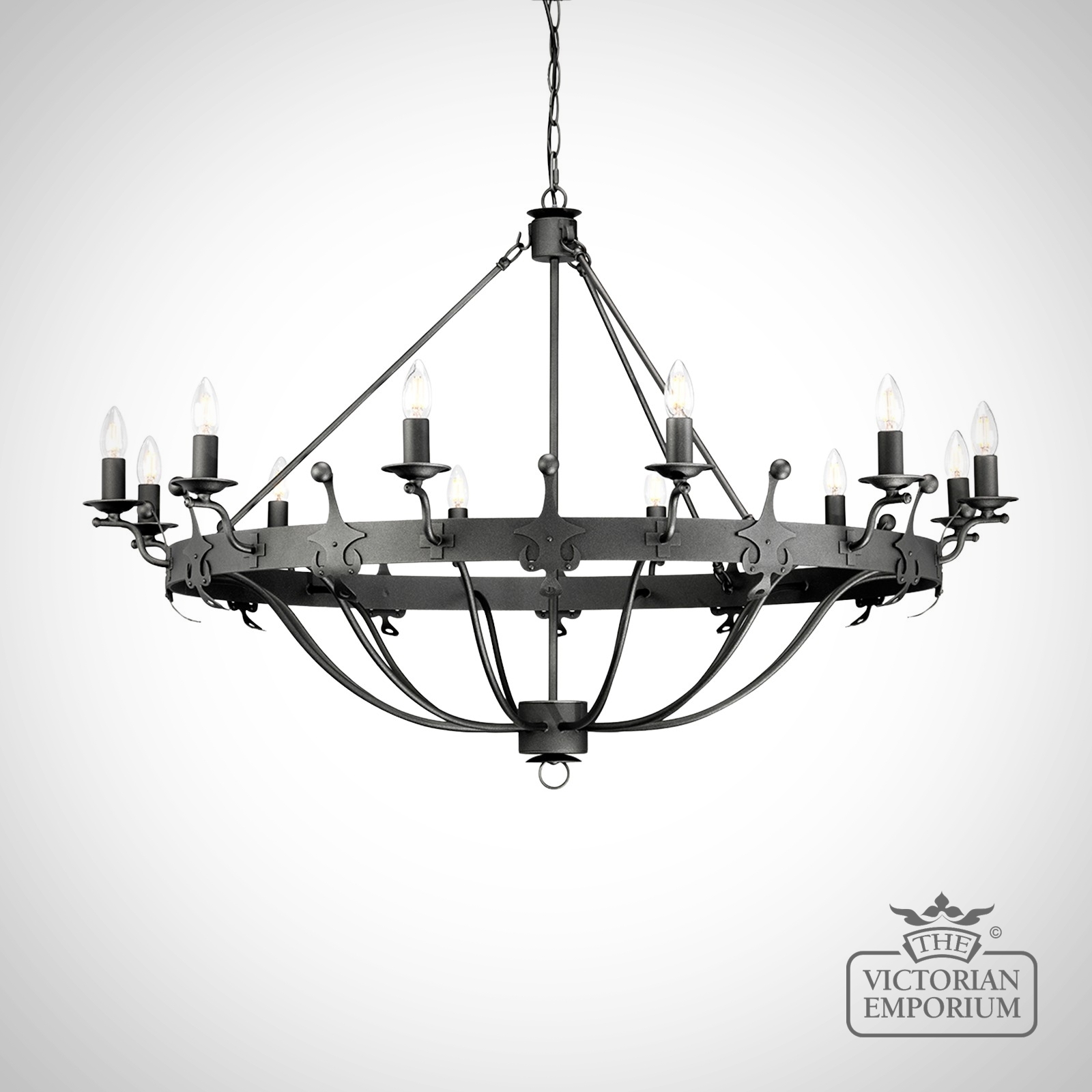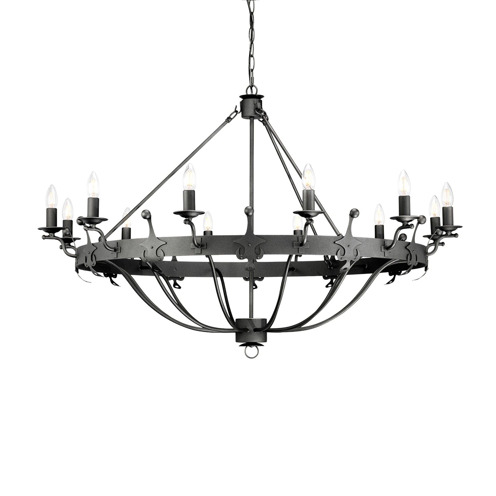 This light design is inspired by royal regalia and features fleur de lys type features on a graphite frame with 12 elegant arms