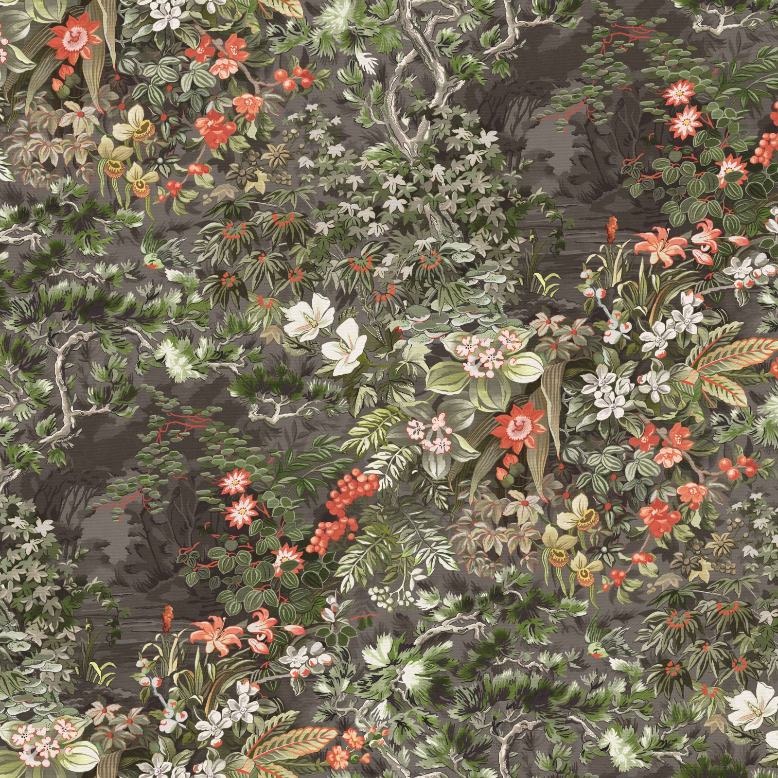 It has familiar woodland themes in a rich tapestry design, large in scale and engrossing in detail, in tones of vivid Coral, contrasted with understated Olive & Charcoal.
