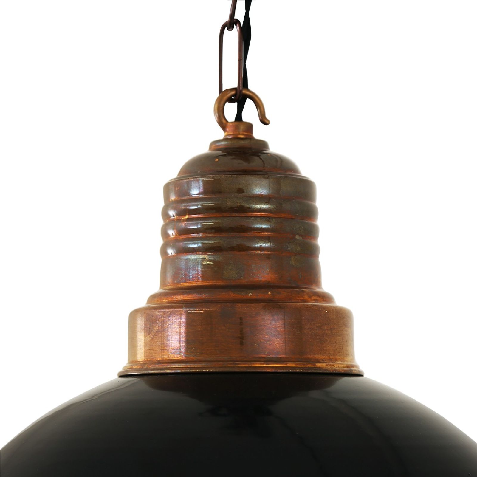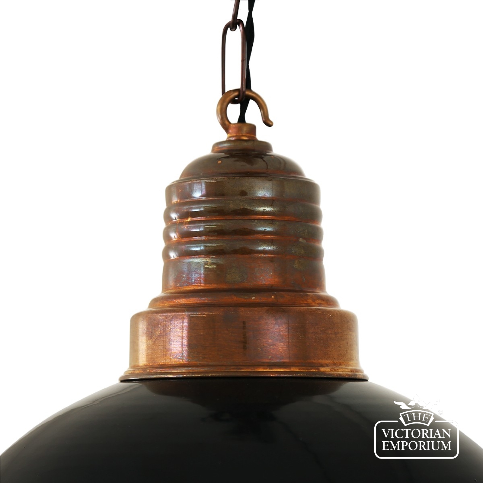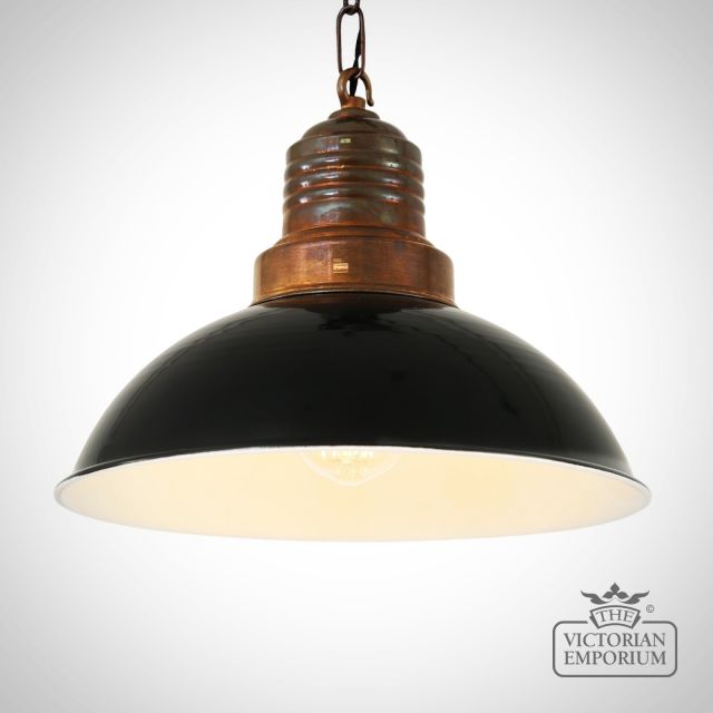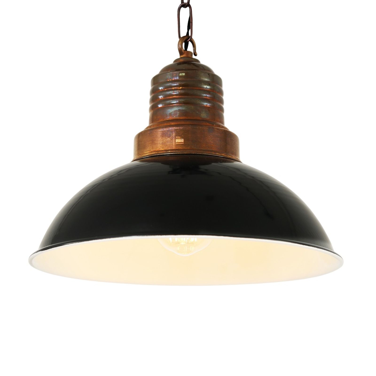 Above the shade is an antique brass decorative top that mimics an oversized Edison screw lamp base, accentuating the industrial nature of this factory pendant. The Ypres light is suspended with antique brass lighting chain and comes complete with matching ceiling rose.